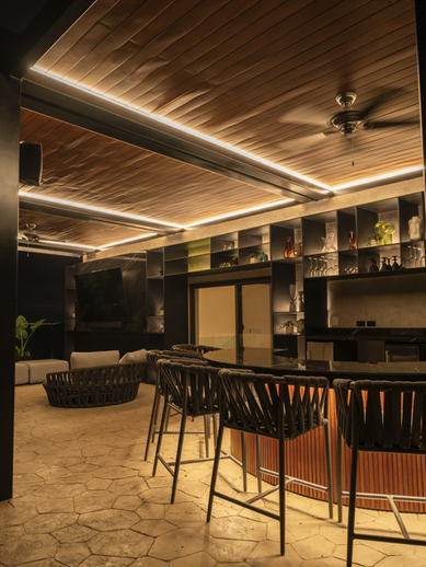 El espacio se divide en distintas áreas funcionales: una cocina-bar ubicada bajo la pérgola, una zona de bbq junto con el comedor y una zona donde se encuentra la piscina con sillones tapizados de tela.